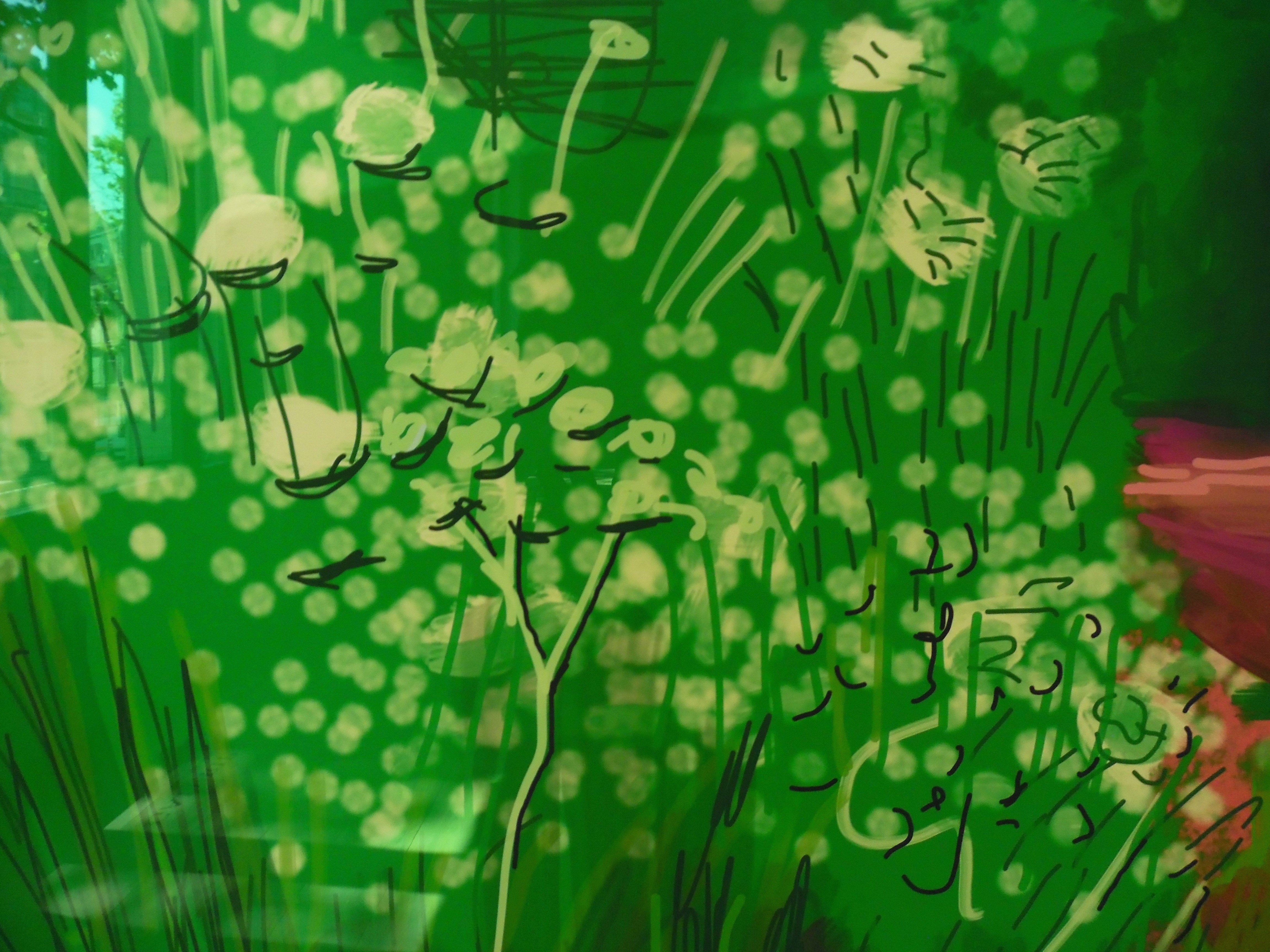 David Hockney présentait à la Galerie Lelong une série de dessin sur le motif réalisé à l’Ipad. Tous sont imprimés en grands formats. Ils prennent place sur les murs du sol au plafond. Des paysages de campagne dans lesquels je retrouve les touches du peintre, les fonds estompés, le trait fluide et rapide ou encore les superpositions de couleurs pop, l’énergie presque impressionniste qui emplissent ces paysages de figuration, de gaieté et d’imaginaire. Moi qui croyais ne plus être étonnée par la peinture de paysage, je me suis bien trompée.