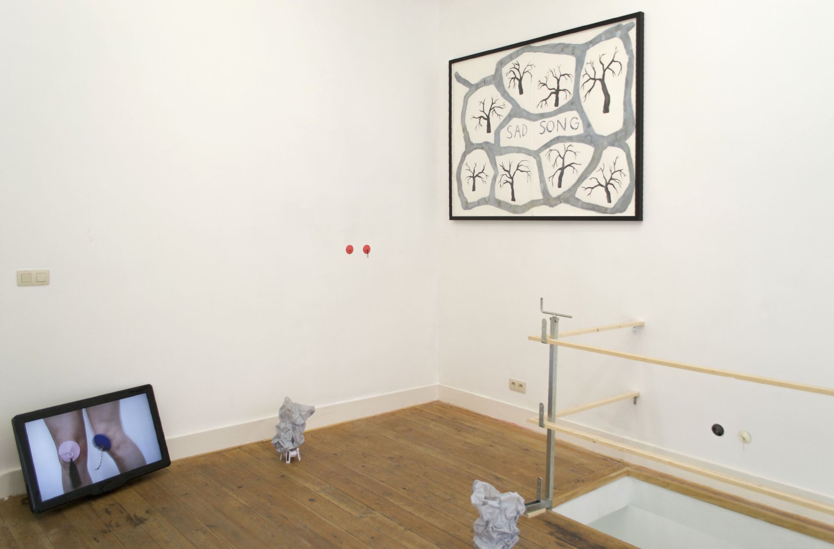 Au sol: vidéo – Gwendoline Perrigueux, sculpture – Guilhem Roubichou.