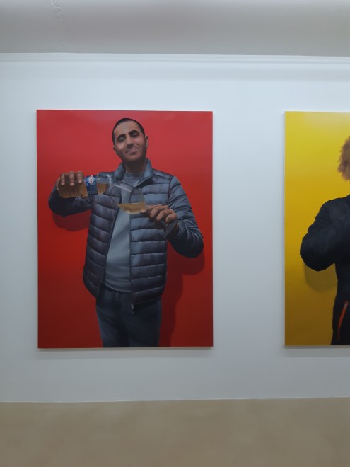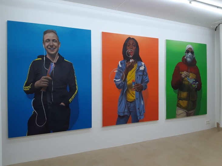 Ses modèles sont ses amis, sa bande, son crew. À l’inverse de la peinture classique, pas de costume d’apparat, de tissus somptueux, ni de signes de pouvoir. Juste des gens, comme vous et moi, en doudoune, jeans ou survêt’, le visage à demi masqués, tenant entre leurs mains un objet choisi par l’artiste. Des objets qui créent une dualité harmonieuse entre leur symbolique et les mains dans lesquelles ils sont introduits. Du Mister Freeze à la vodka redbull dans une bouteille de cristalline. Du paquet de bonbons multicolores à la fleur de lys ou en passant par le fameux Capri-sun, cette boisson multivitaminé dans sa poche de plastique argentée et bleu, tant prisée l’été. Tout autant d’objets de consommation populaire, vanités de notre monde contemporain, qui nous renvoient ici, à un entre-deux de la vie, dans lequel l’amitié et la fraternité joue un rôle puissant. Celui du passage du temps de la vie. Du passage du monde insouciant de l’enfance à celui, plus intransigeant de l’âge adulte.