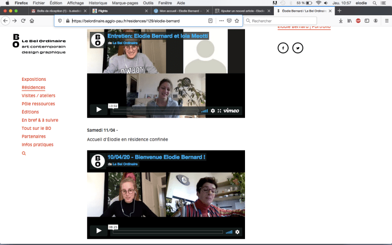 […] La résidence prend alors la forme d’un dispositif d’immersion virtuelle : un entretien de 3 à 4h comme si nous étions dans l’atelier. L’écran posé ici, une tasse de thé, de café à la main, ou une bière selon l’heure. Ayant bien conscience des limites de ces outils dans l’appréhension de l’œuvre, il s’agit surtout d’un temps fort de travail qui me permettra un premier contact avec les artistes avant de revenir lorsque le monde aura repris son rythme de croisière.